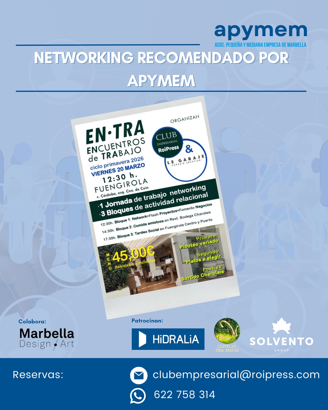 Este ciclo está organizado por Club Empresarial Roipress en colaboración con Le Garage, Espacio Creativo, y está recomendado por APYMEM, Asociación de la Pequeña y Mediana Empresa de Marbella.